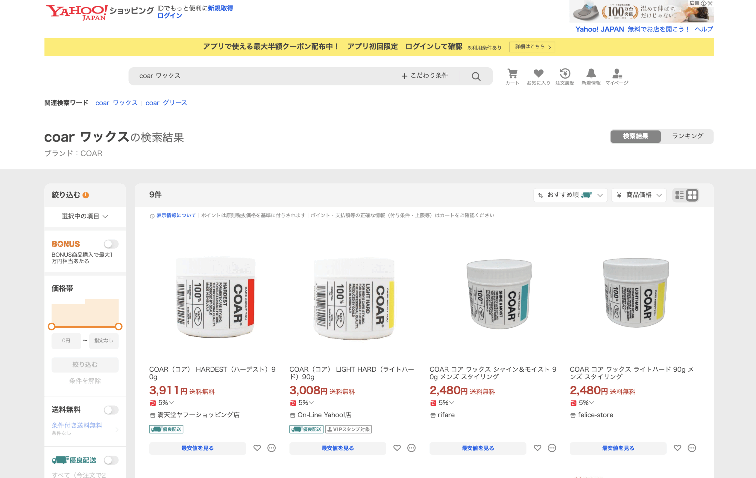 ヤフーショッピングにもCOARヘアワックスはあります。