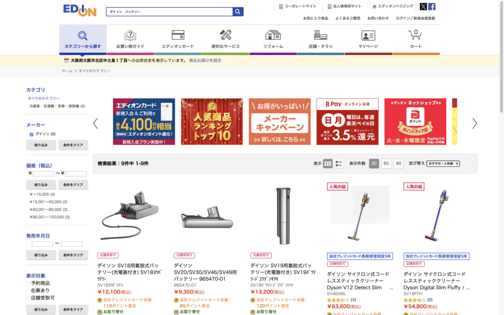 ダイソン本体も販売している家電量販店で、ダイソンのバッテリーは販売されています。
