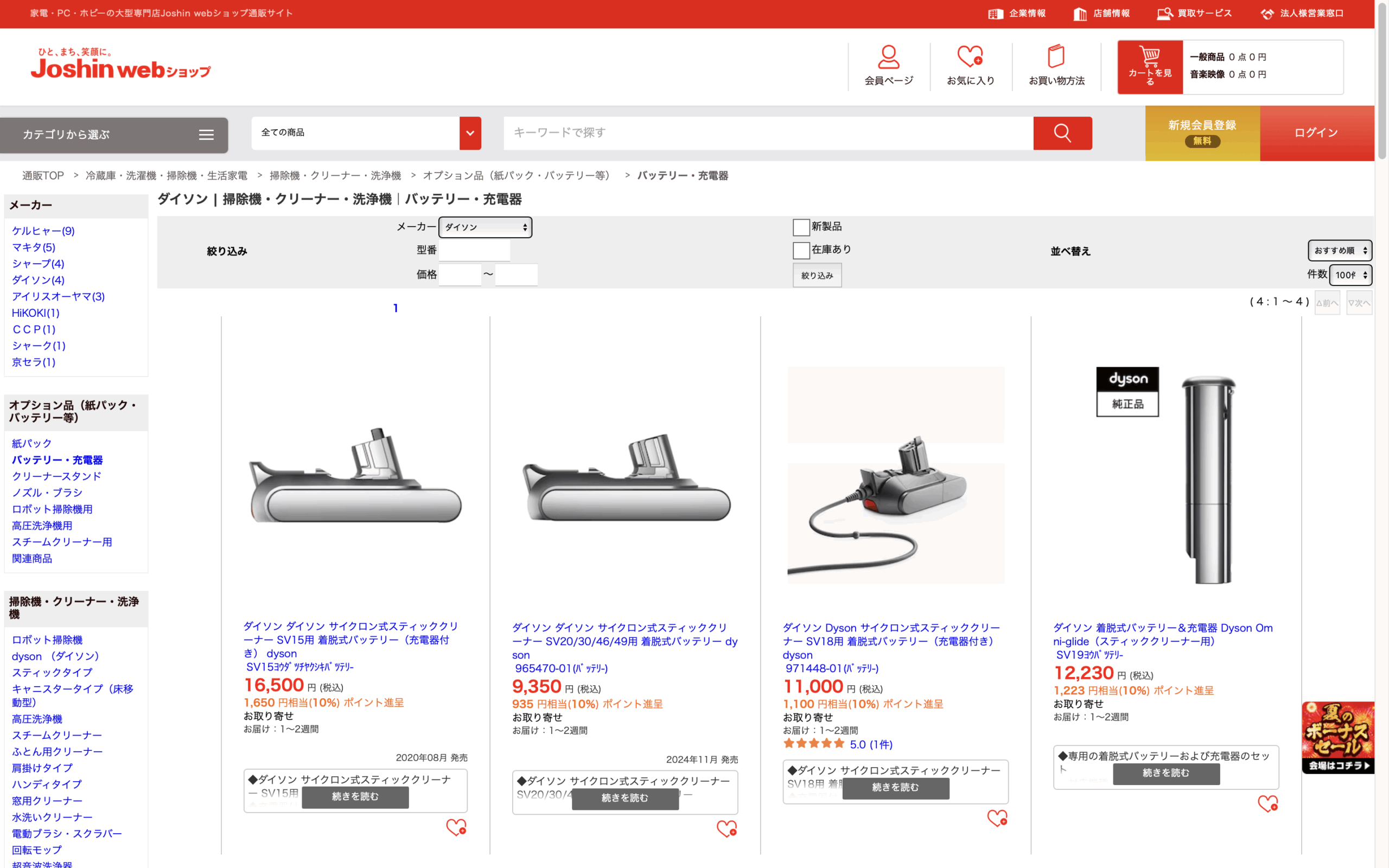 ジョーシンにもダイソンのバッテリーはあります。配送料は税込2980円のお買い上げで無料です。ジョーシンのポイントは10%還元になります。実店舗では楽天ポイントが付きます。