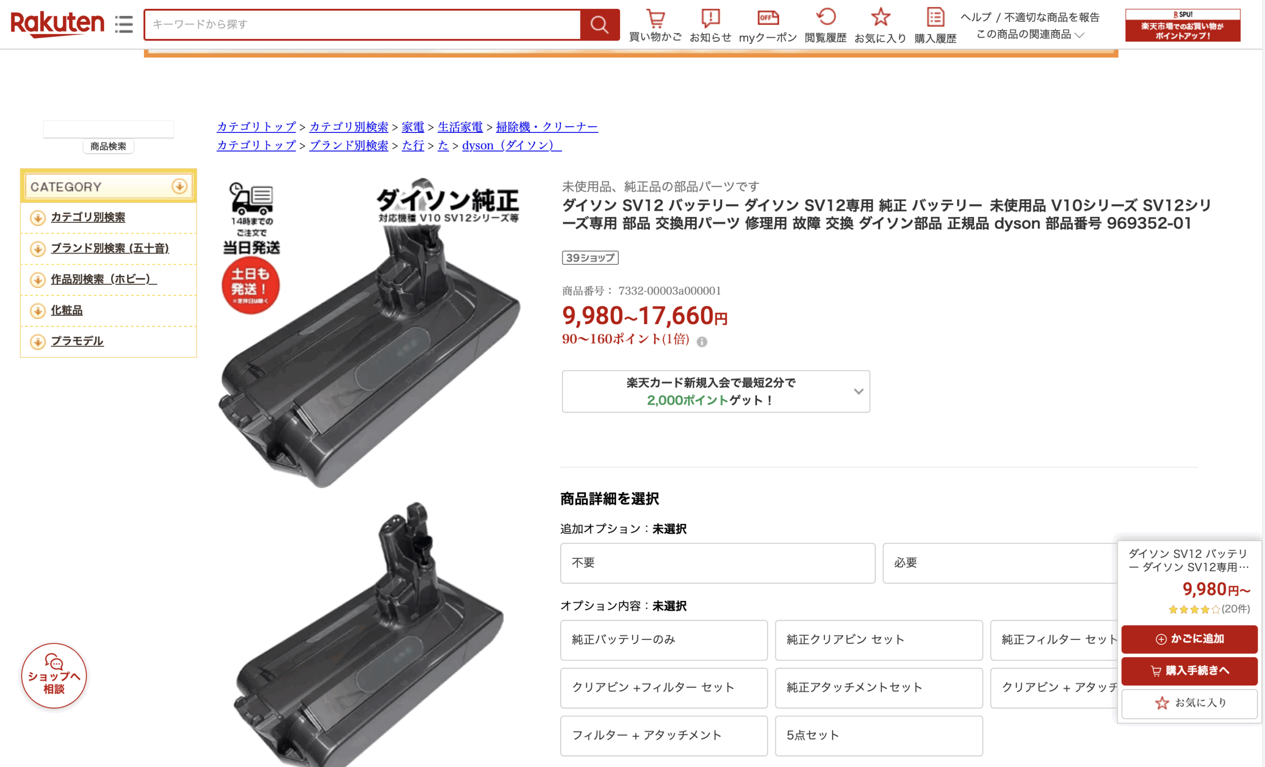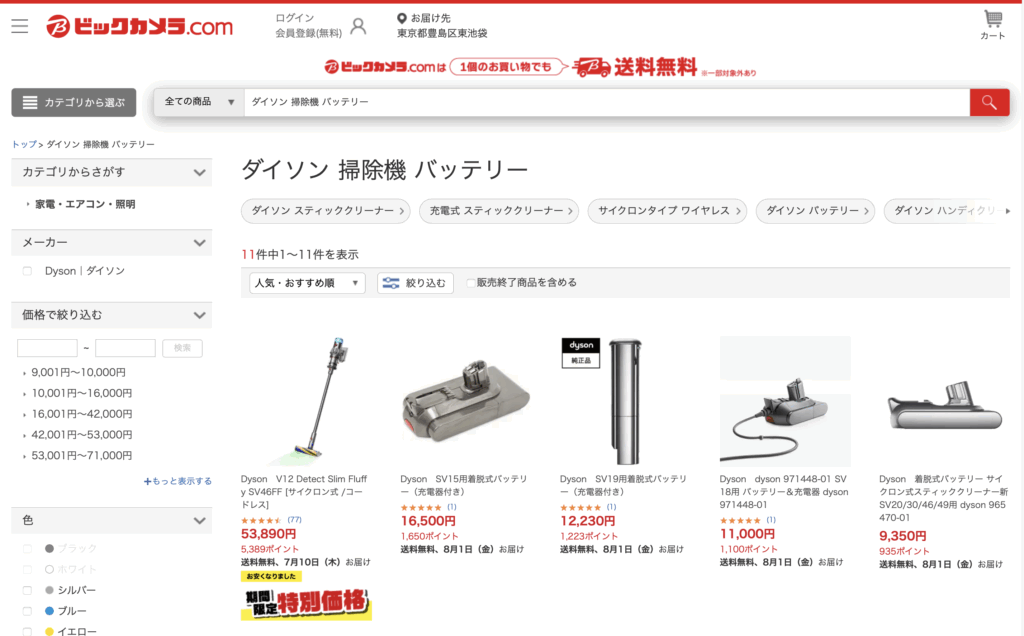 ビックカメラにもダイソンのバッテリーは販売されています。ヨドバシと同に価格は型番によって9350円〜16500円。通販では配送料が無料で、ポイントは10%還元となっています。実店舗では楽天ポイントを貯めることができます。
