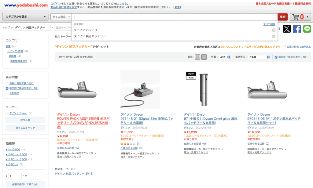 ヨドバシカメラでは、ダイソンの純正バッテリーが売っています。価格は型番によって9350円〜16500円。通販では配送料は無料で、ヨドバシカメラのポイント(ゴールドポイント)は10%還元で付くところが魅力的です。