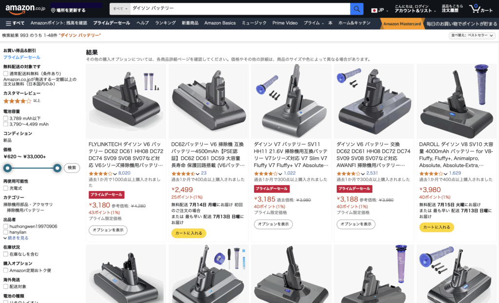 アマゾンにはダイソンの公式ページがありますが、純正バッテリーは販売されていませんでした。検索してみても、ほとんどが互換性バッテリーでした。