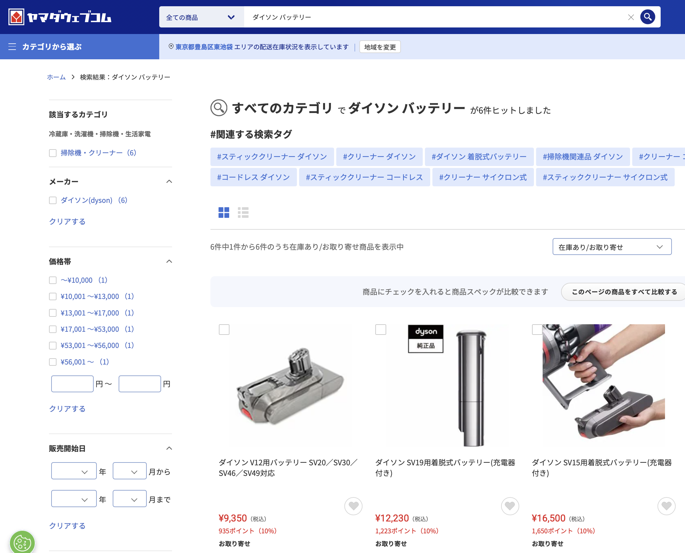 ヤマダデンキでもダイソンのバッテリーはあります。配送料は無料で、ポイントは10%還元です。