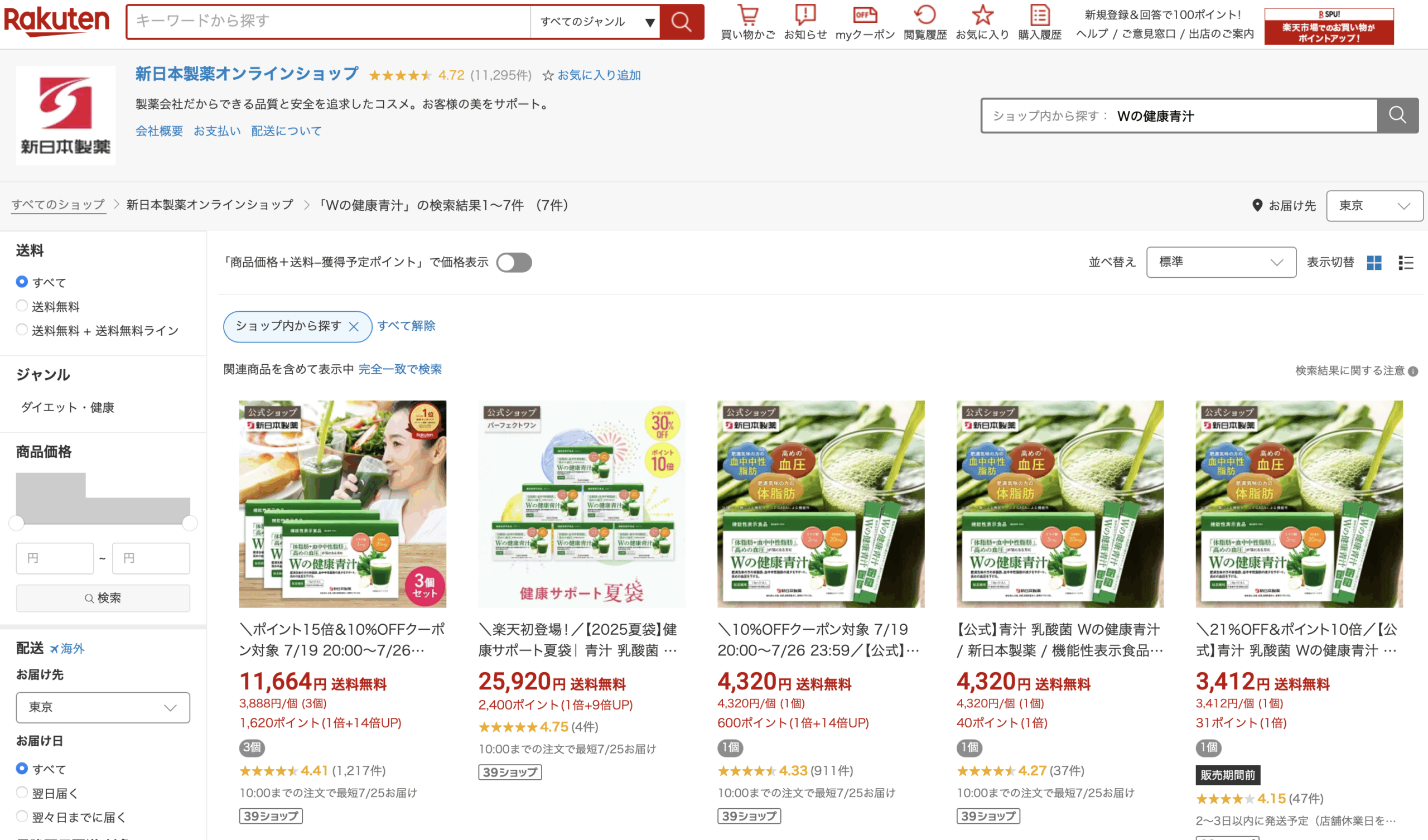 楽天市場にもWの健康青汁は売っています。定期便はありませんが、クーポンやポイントアップキャンペーンを使えばお得に購入することができます。