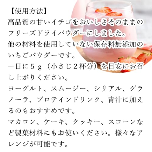 品質の高いいちごをそのままフリーズドライに加工し、パウダー状にした商品となります。香料、保存料、添加物を使用していないいちごパウダーです。様々な種類のスイーツにうってつけの商品となっています♪